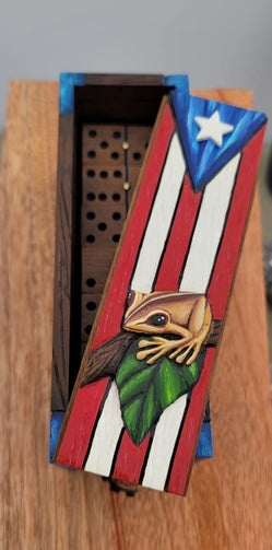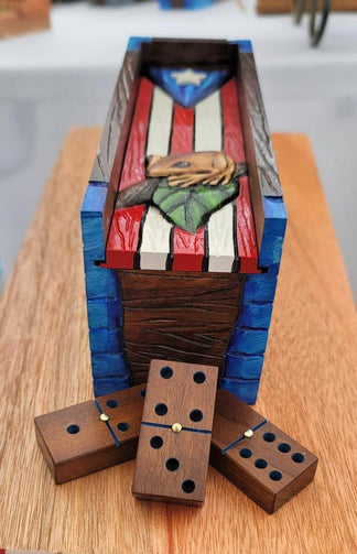 Made from ethically sourced Caoba (Mahogany) trees from the island of Puerto Rico, hand-carved and handcrafted into a treasure domino set of superb quality. This set features the coquí, a beloved symbol of Puerto Rico, set against a backdrop of the Puerto Rican flag. Each set is hand-carved to offer you a unique, one-of-a-kind, quality heirloom piece that will bring you and your family joy for years to come.