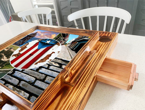 Una hermosa mesa de dominó hecha a mano en Puerto Rico por artesanos locales. Es plegable, con cuatro portavasos, cuatro patas, cuatro porta dominó y una bandeja de almacenamiento para dominó. Está hecho de pino blanco y contiene una imagen en el centro junto con un "handle" para transporte. Este producto incluye tanto el tablero como las patas de la mesa. Pesa sobre 25 libras.